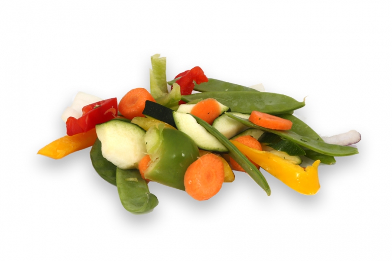Roerbakgroente bestaande uit courgette, wortel, witte ui, rode/gele/groene paprika en peulen.